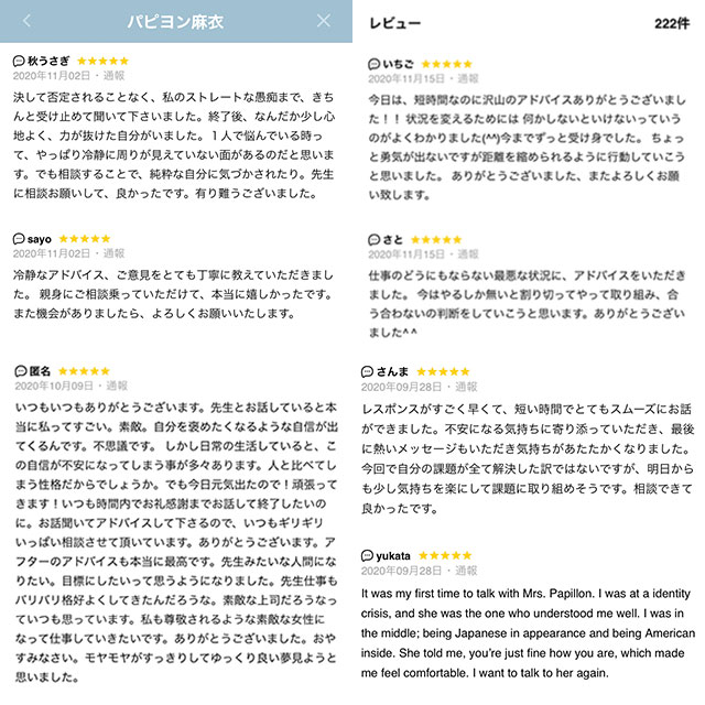 海外在住で、外国人との結婚もされている先生ということもあり、外国あるあるや外国人男子あるあるを理解してもらえ、とてもスッキリしました。 でも一番の収穫は、相手が誰であろうと、どこに住んでいようと、大切なのは自分なんだと気づけたことです。 いろんな方に相談をしても、どうしても同じ悩みに戻ってしまう私が、今では私がイニシアチブを持つ関係で 自由に生きられている実感があります! 目の前の悩みだけじゃなく、これまでの人生背景や考えグセみたいなものまで調整していただけ、最後にエナジーを注入されて元気に飛び出していけた!という実感があります! 気さくにお話くださるので、是非皆さんにも試していただきたいです♡