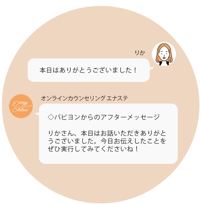 カウンセリング終了後、担当したカウンセラーから時間内にお伝えしきれなかったアドバイスやメッセージとアンケートをお送りさせていただいております。