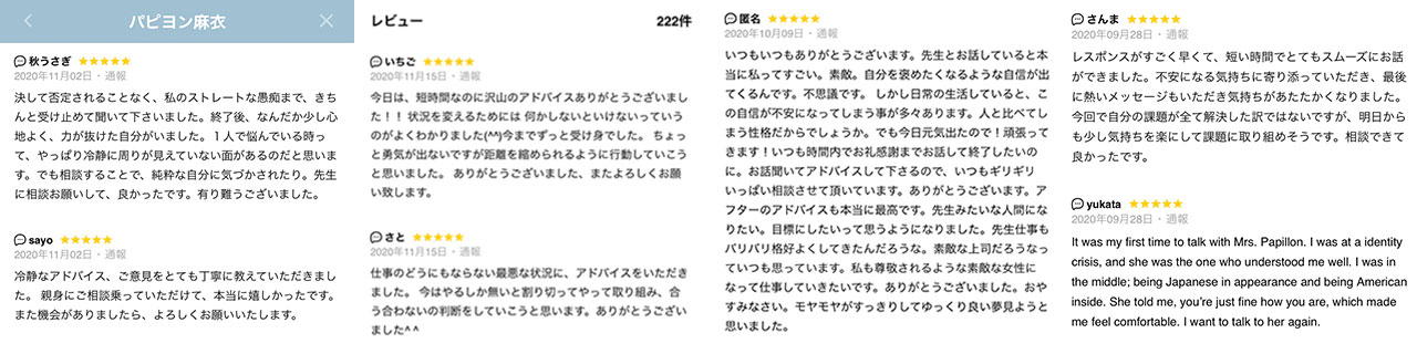 海外在住で、外国人との結婚もされている先生ということもあり、外国あるあるや外国人男子あるあるを理解してもらえ、とてもスッキリしました。 でも一番の収穫は、相手が誰であろうと、どこに住んでいようと、大切なのは自分なんだと気づけたことです。 いろんな方に相談をしても、どうしても同じ悩みに戻ってしまう私が、今では私がイニシアチブを持つ関係で 自由に生きられている実感があります! 目の前の悩みだけじゃなく、これまでの人生背景や考えグセみたいなものまで調整していただけ、最後にエナジーを注入されて元気に飛び出していけた!という実感があります! 気さくにお話くださるので、是非皆さんにも試していただきたいです♡